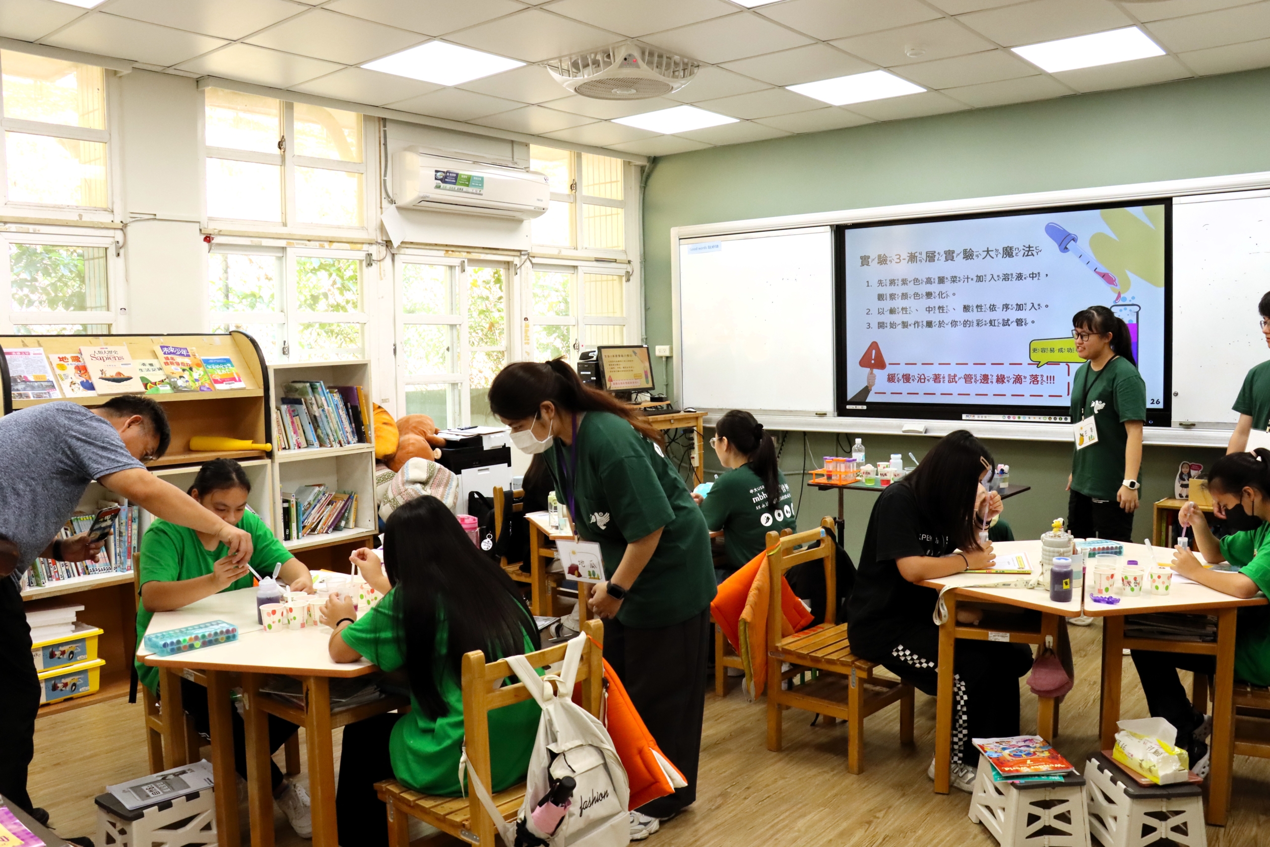 The day’s lesson, themed “Environmental Education,” was led by graduate students from National Central University’s Institute of Environmental Engineering and designed for sixth graders. Titled “Becoming an Everyday Acid–Base Expert,” it began with familiar household items—soap, cola, lemon juice, and baking soda—to introduce acidity and alkalinity, then extended to the link between pH and water quality. The instructor explained vividly how an imbalance in water pH can harm aquatic life and even lead to eutrophication. Issues that once felt distant suddenly came into focus: from the drinks in our hands to the clarity of our rivers, daily life is bound up with science and responsibility.