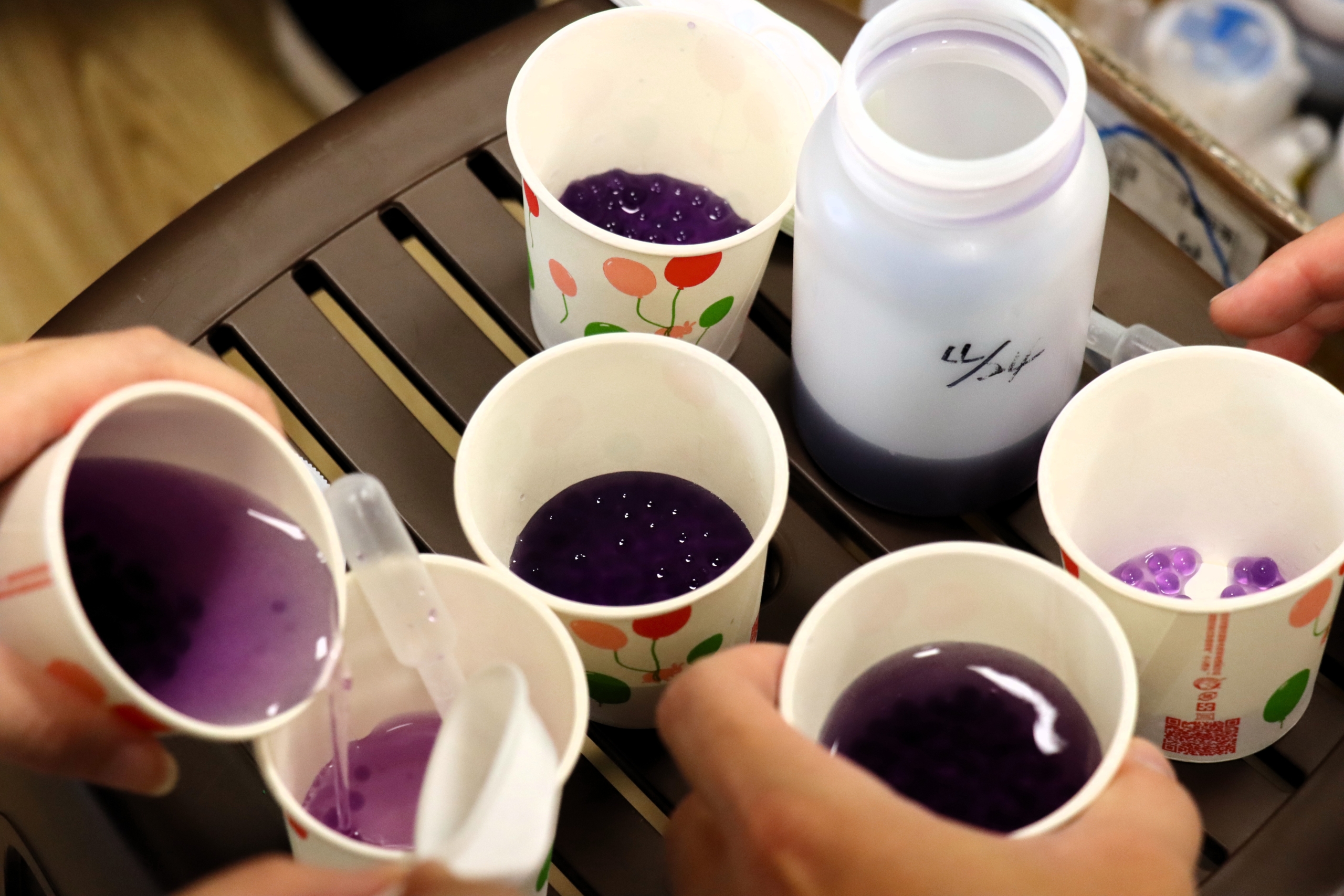Next came the visually captivating Color-Changing Pearls. The mentors mixed sodium alginate with purple cabbage juice and dropped the mixture into a calcium chloride solution to form delicate purple “pearls.” Students placed the pearls into baking soda, detergent, citric acid, and soda solutions, then watched the hues transform. As the pearls slowly changed color, the classroom buzzed with discussion—curiosity and excitement in their most genuine form.